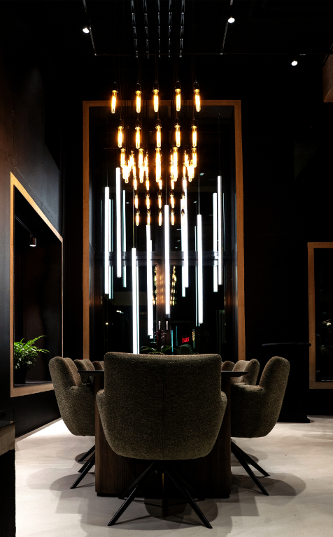 Ein besonderes Element bildet die Loft-Filament-Welle, die als skulpturale Lichtinstallation eingesetzt wurde. Sie erzeugt eine warme, fast atmosphärische Grundstimmung, bildet einen bewussten Kontrast zur klaren Architektur und setzt ein emotionales Zeichen im Raum, ohne laut zu sein. Ergänzend dazu wurde präzise Akzentbeleuchtung zur Betonung von Materialien, Kücheninseln und Zonen, eingesetzt. Unterschiedliche Abstrahlwinkel, eine warme Lichtfarbe und eine klare Entblendung sorgen dafür, dass Holz, Stein und matte Oberflächen ihre Tiefe und Wertigkeit entfalten. Das Licht strukturiert so den Raum, ohne ihn zu dominieren. Das Ergebnis ist ein Lichtkonzept, das sich bewusst zurücknimmt und genau dadurch wirkt. Es unterstützt die Haltung von Kitchencrew: Küchenplanung als Prozess, als Dialog und als Erlebnis.